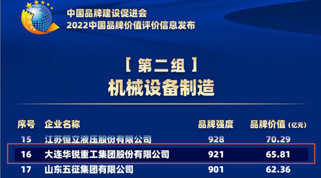 6月8日,遼寧省品牌建設促進會發布2022年度遼寧省品牌價值評價信息,評價結果顯示,大連重工裝備集團下屬大連華銳重工集團股份有限公司(簡稱“大連重工”)以94.74億元的品牌價值,居企業品牌價值榜第一位。