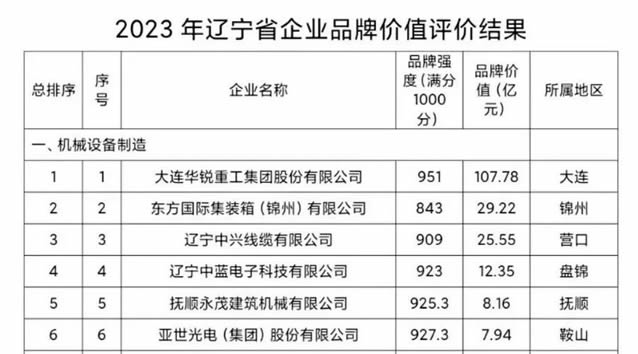 近日,遼寧省品牌建設促進會聯合遼寧廣播電視臺發布了2023年度遼寧省品牌價值評價信息,評價結果顯示,大連重工以951分(滿分1000分)的品牌強度、107.78億元的品牌價值,位居機械設備制造企業榜第一位。