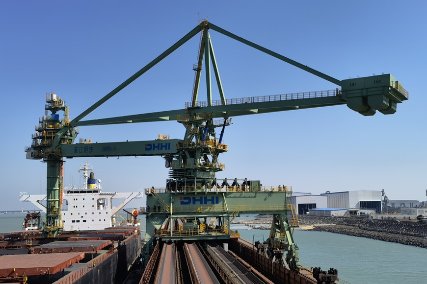 卸船機方面,大連重工研制的卸船機種類有抓斗卸船機、連續卸船機、鏈斗卸船機,用來卸載礦石、煤炭等原料的散狀物料機械。適應船型從3000噸級至40萬噸級散貨船,生產能力從500t/h至3600t/h。大連重工研制的卸船機技術先進,性能完備,使用可靠,自重輕,穩定性好,卸船效率高,使用壽命長,維護方便。