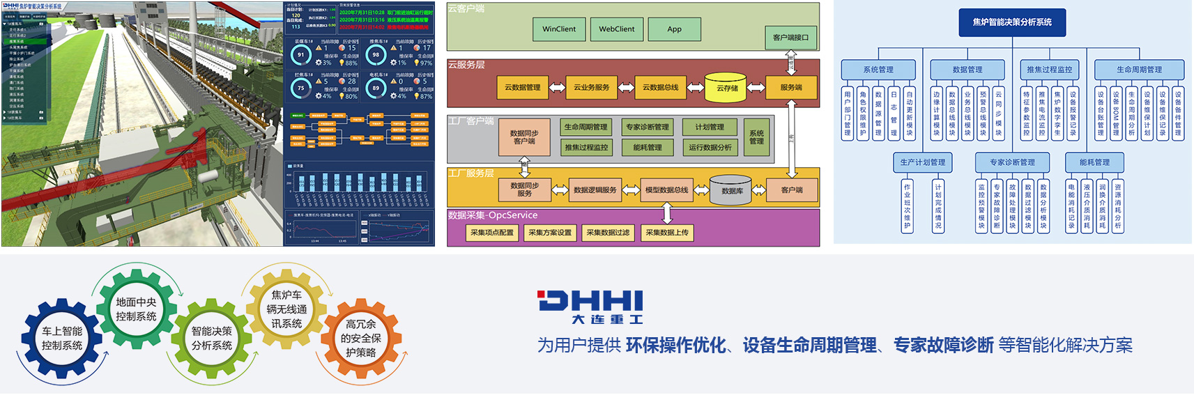 大連重工擁有焦?fàn)t機(jī)械專業(yè)化生產(chǎn)基地,設(shè)計(jì)、生產(chǎn)、制造的智能化焦?fàn)t機(jī)械設(shè)備已經(jīng)實(shí)現(xiàn)脫離操作或值守人員,按照生產(chǎn)計(jì)劃在無(wú)人操作模式下自動(dòng)運(yùn)行,具備危險(xiǎn)源識(shí)別、智能決策、故障預(yù)防、故障報(bào)警停機(jī)等功能,可向客戶提供環(huán)保操作優(yōu)化、設(shè)備生命周期管理、專家故障診斷等智能化解決方案。